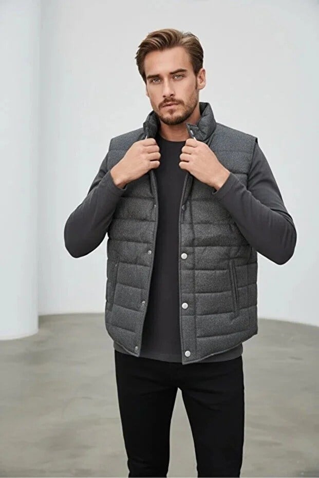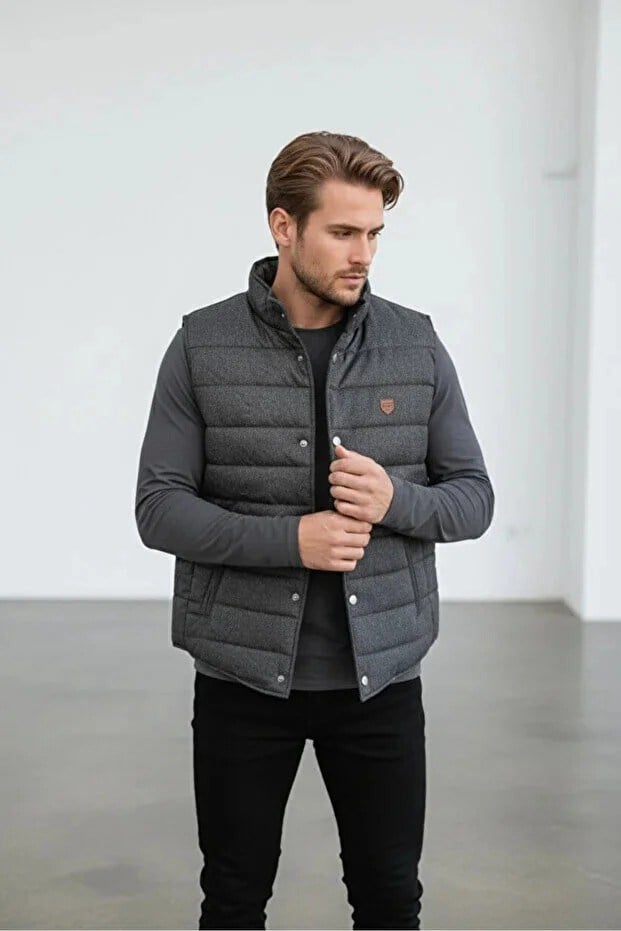 Erkek Şişme Yelek Hafif Dolgulu Günlük Spor Kullanım Dik Yaka Fermuarlı Düğmeli Modern Tasarım Füme Renk-10007