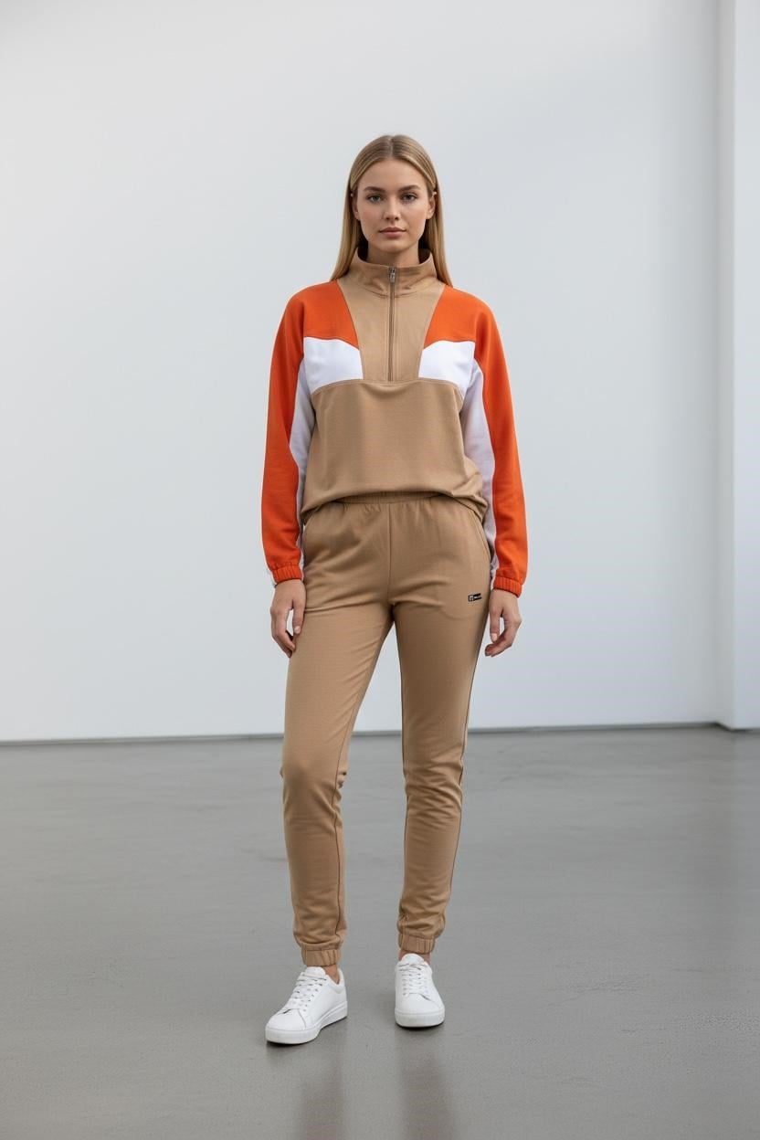 Kadın İki İplik Dik Fermuarlı Yaka Lastikli Paça Uzun Kollu Bej Eşofman Takımı - 7774