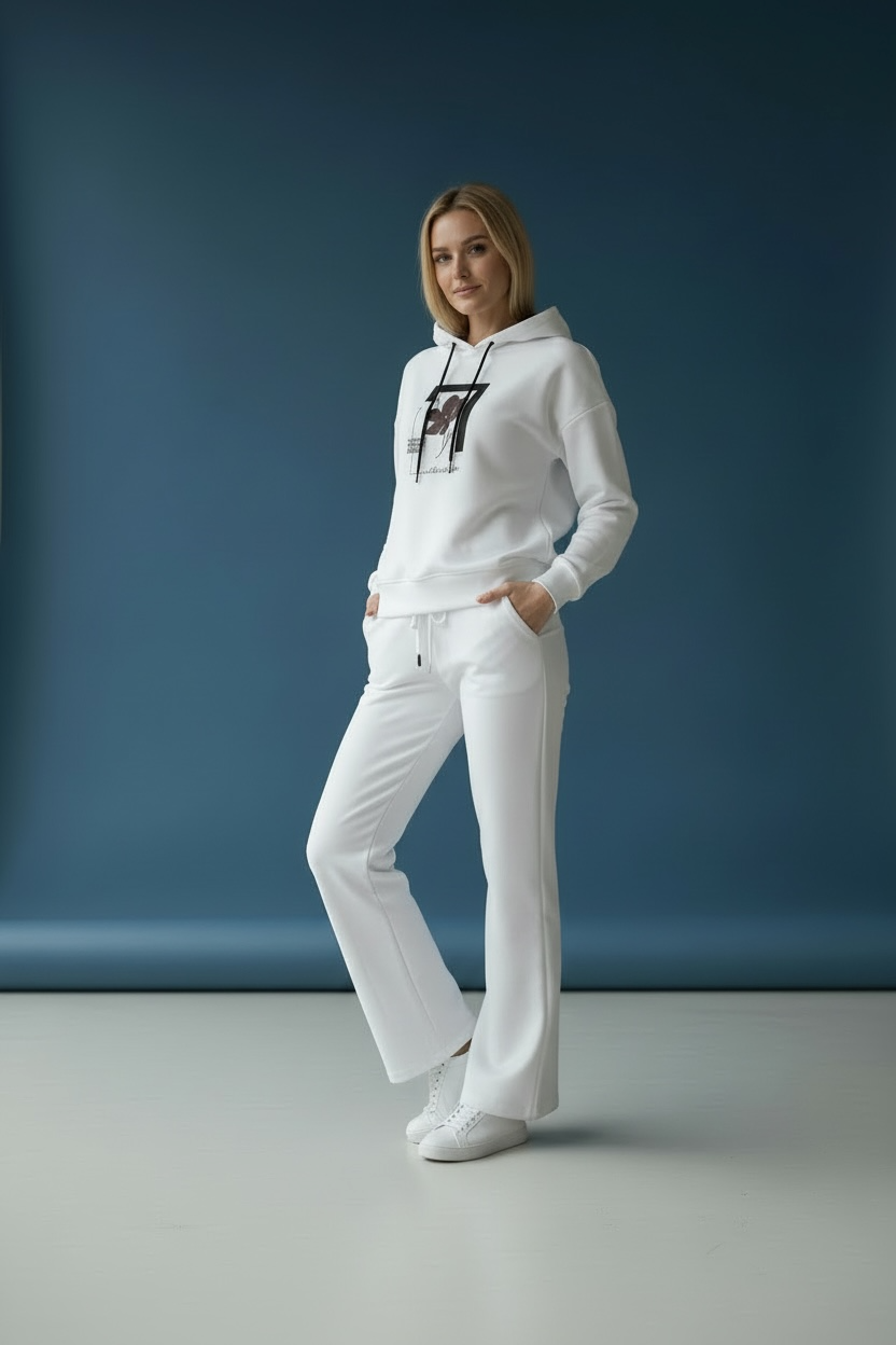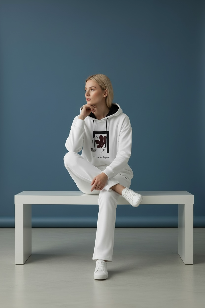Kadın İki İplik Kapüşonlu Cepli Çiçek Baskılı Geniş Paça Beyaz Eşofman Takımı - 7794