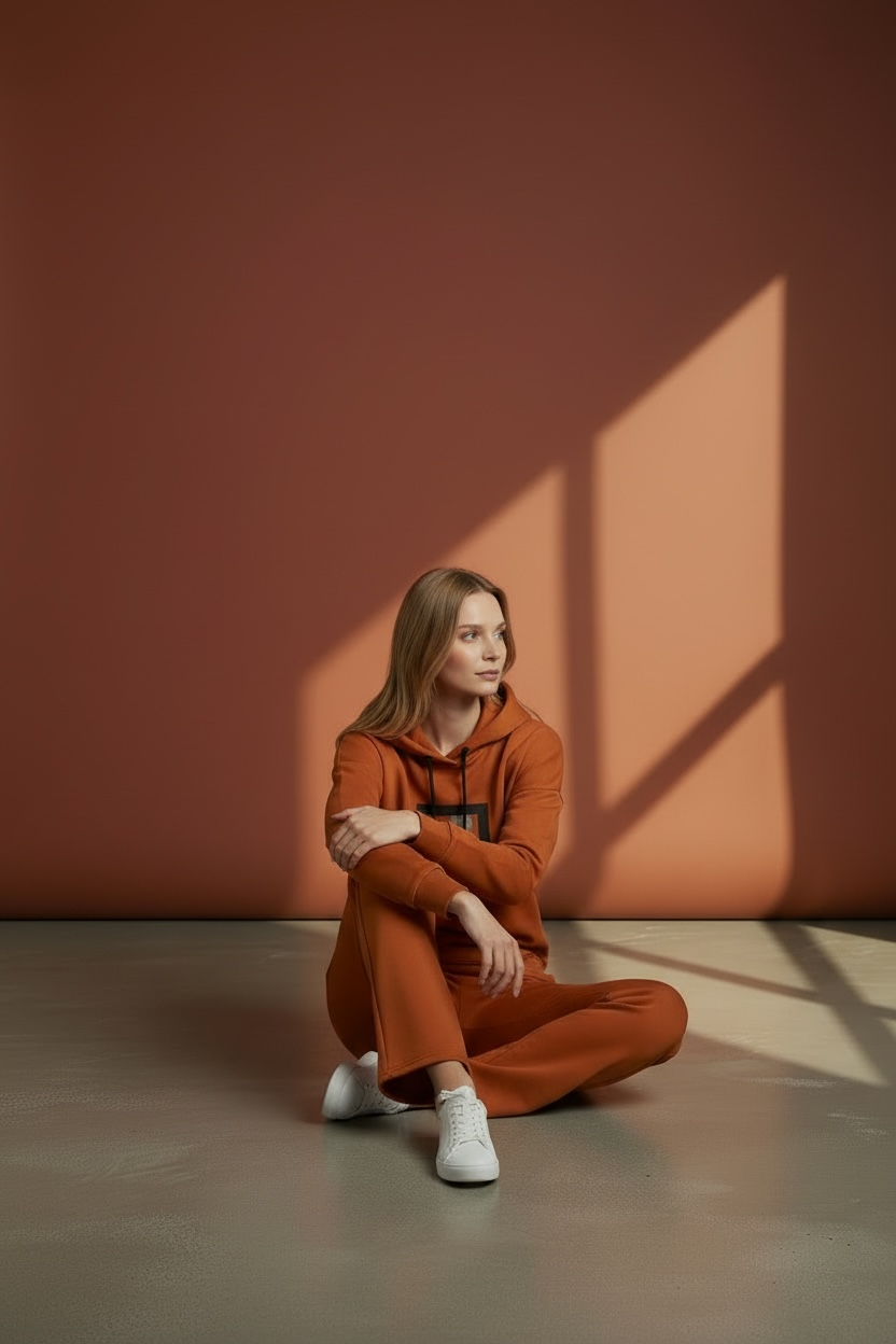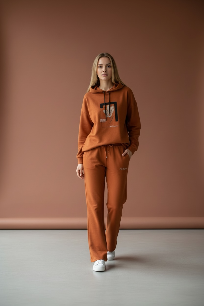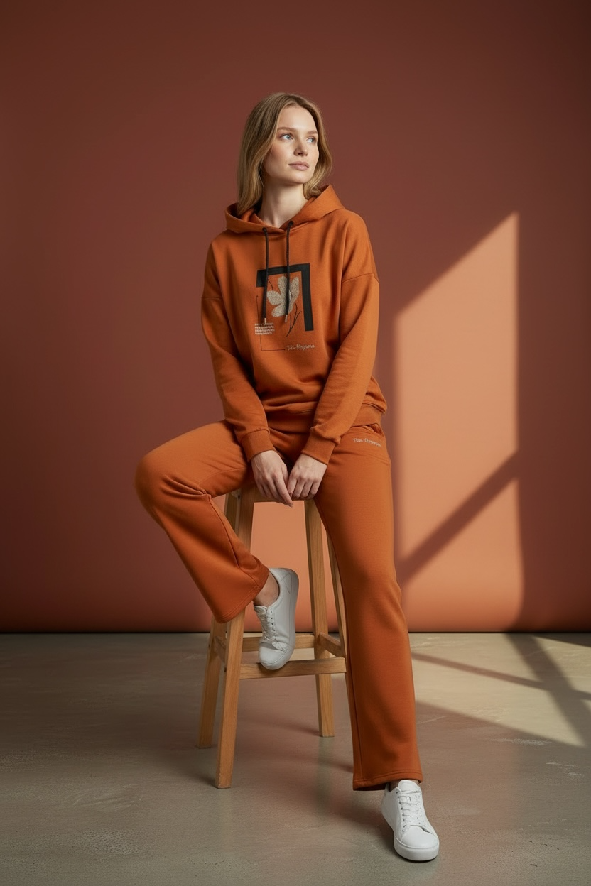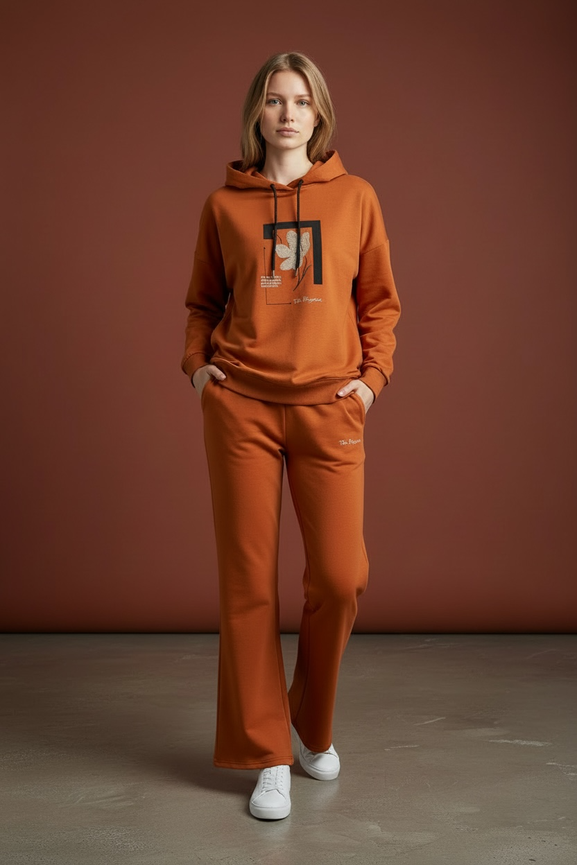 Kadın İki İplik Kapüşonlu Cepli Çiçek Baskılı Geniş Paça Kiremit Eşofman Takımı - 7794