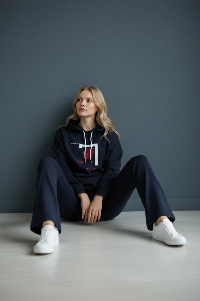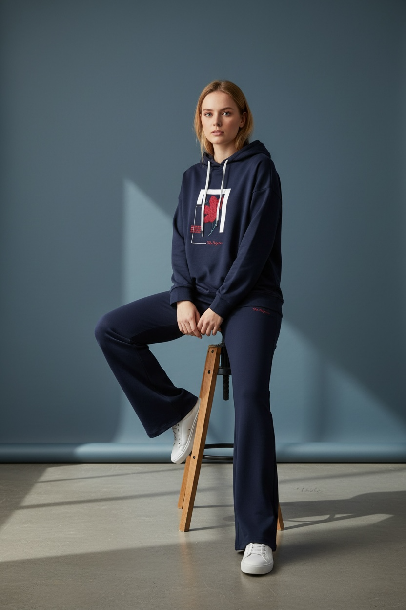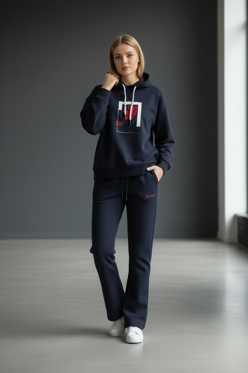 Kadın İki İplik Kapüşonlu Cepli Çiçek Baskılı Geniş Paça Lacivert Eşofman Takımı - 7794
