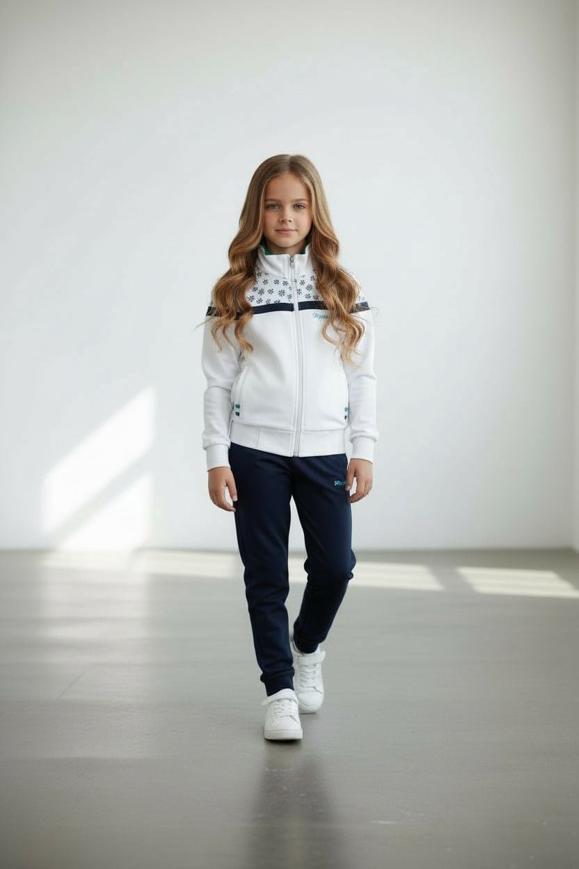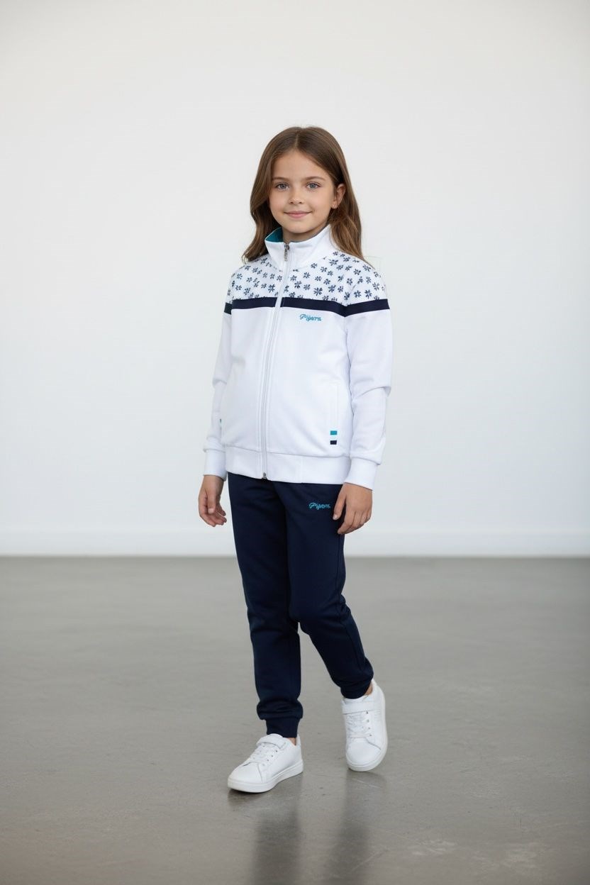 Kız Çocuk Lastikli Paça Fermuarlı Beyaz Eşofman Takımı - 40006