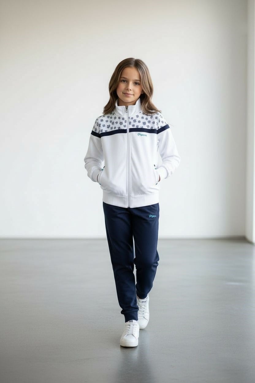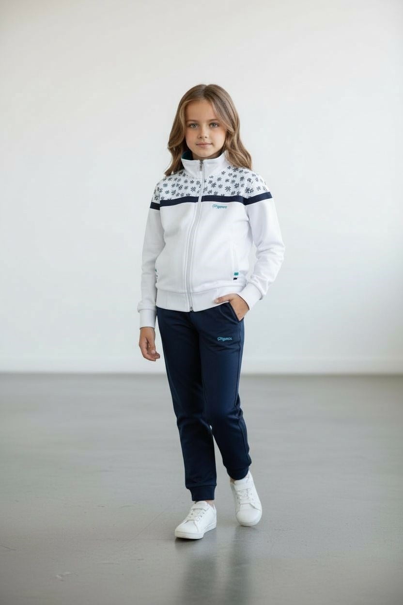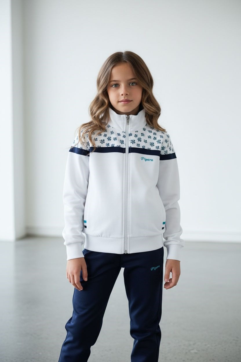 - Rahat hareket etmeyi seven kız çocukları için ideal, lastikli paça ve fermuarlı tasarımıyla pratik kullanım sunar.; - Standart kol ve uzun paça boyu ile mevsim geçişlerinde konforlu bir deneyim sağlar.; - Pamuklu kumaşı sayesinde cildi tahriş etmeden gün boyu rahatlık sunar.; - Dik yaka tasarımı ile şık bir görünüm sergilerken, çift cepli yapısı küçük eşyaları taşımak için idealdir.; - Desenli ve beyaz renk seçeneğiyle göz alıcı bir stil oluşturur; 13 yaş grubuna uygun regular kalıp ile vücuda tam oturur.; - Tekli paket içeriğiyle hem sweatshirt hem de pantolonu içeren bu takım, genç kızların spor aktivitelerinde tercih edebileceği basic bir siluete sahiptir.; - 2 iplik dokuma tipi ve örme kumaş yapısı dayanıklılığı artırırken, ilkbahar ve sonbahar sezonları için uygunluğunu korur.; - Sportswear koleksiyonunun bir parçası olarak tasarlanan bu eşofman takımı, sportif ortamlar için mükemmel bir seçimdir.