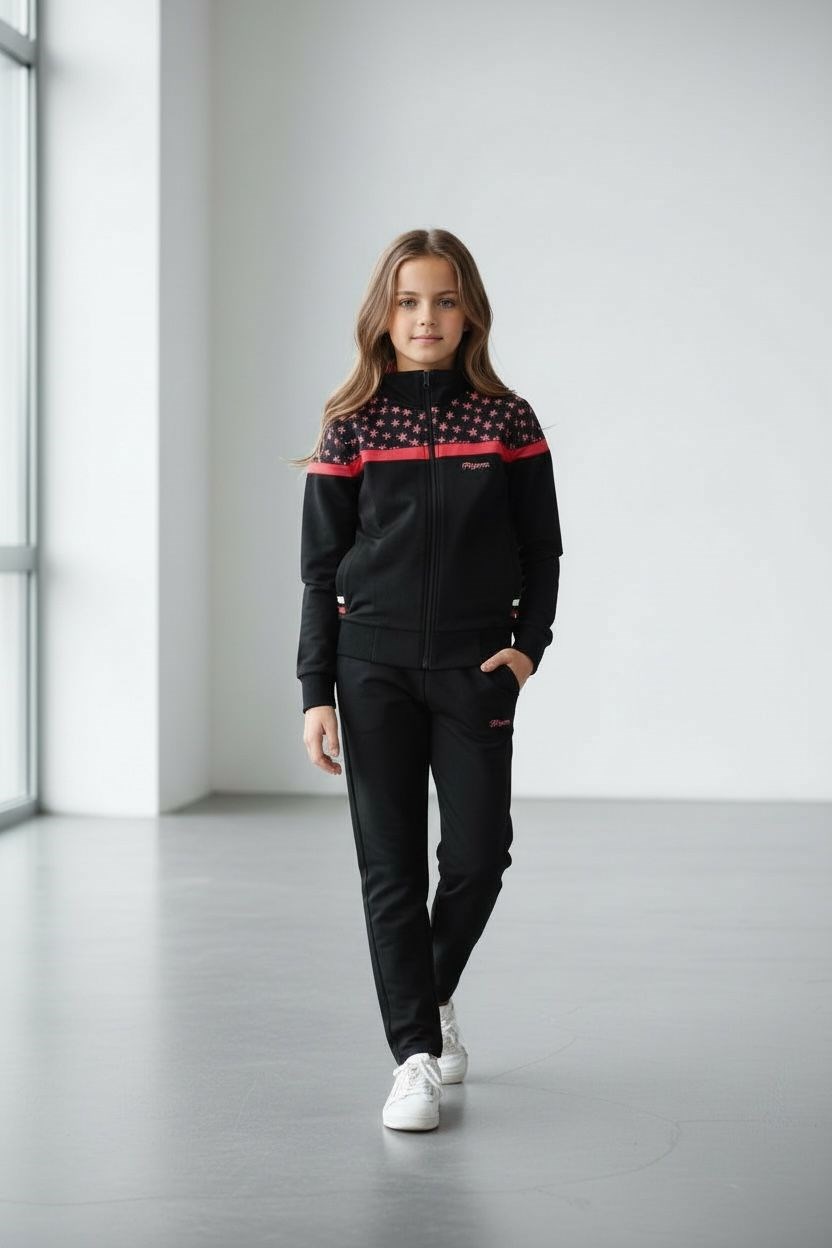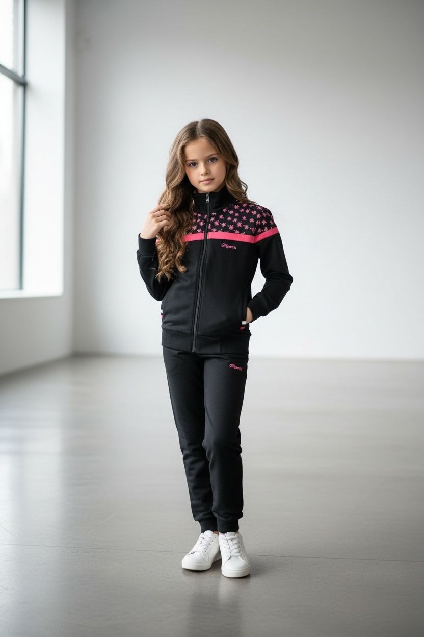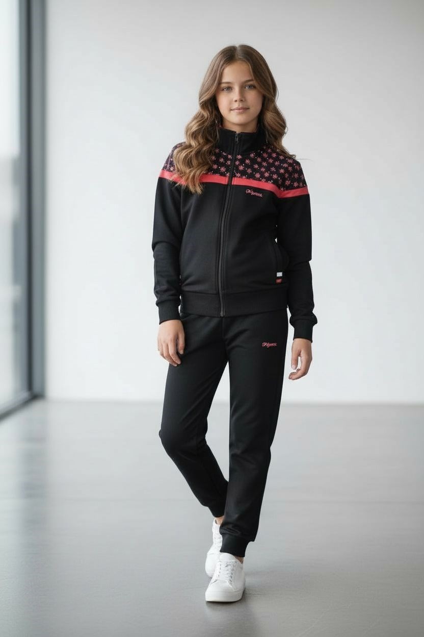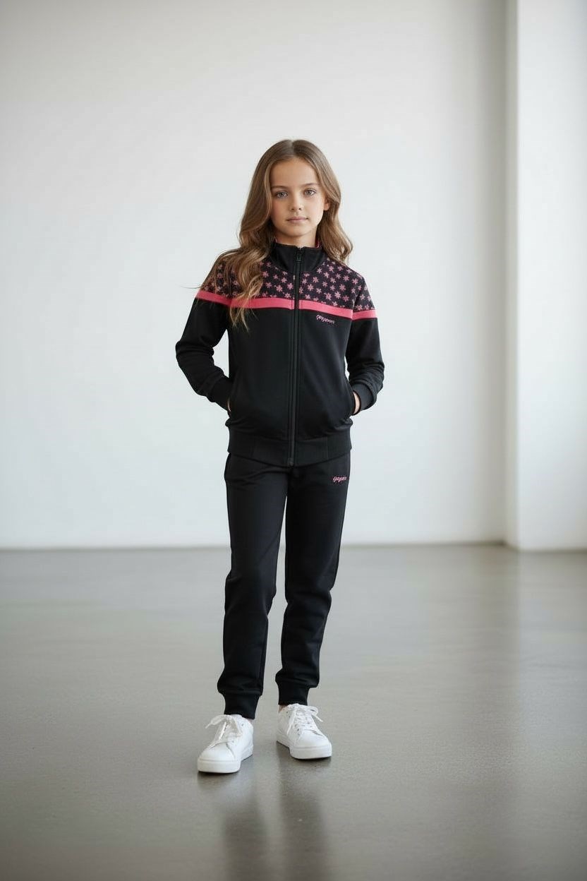 Kız Çocuk Lastikli Paça Fermuarlı Siyah Eşofman Takımı - 40006